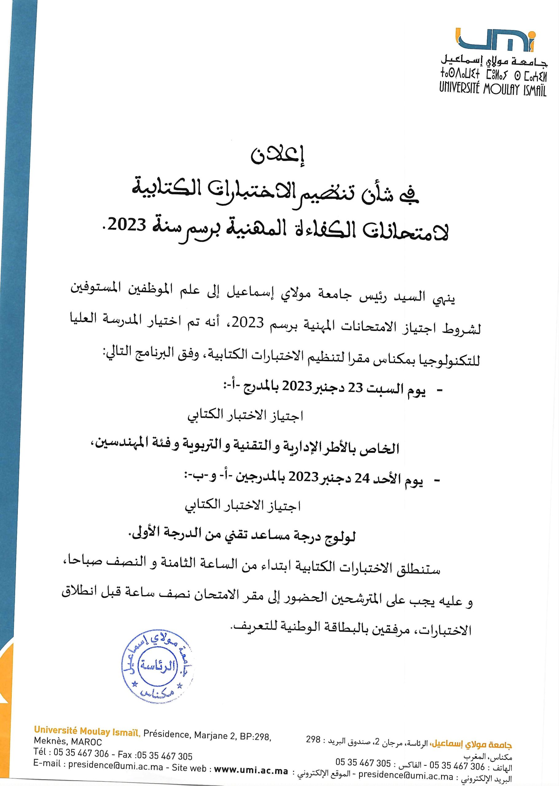 Vous devriez également aimer Appel à candidature pour les journées scientifiques Québec-Maroc en développement durable2 mars 2023 النتيجة النهائية لمباراة توظيف أستاذ محاضر لفائدة كلية العلوم والتقنيات بالرشيدية (منصب واحد) – Génie des procédés chimiques : تخصص2 janvier 2025 Avis de préinscription : Licence Professionnelle (EST-Khénifra)24 juillet 2017