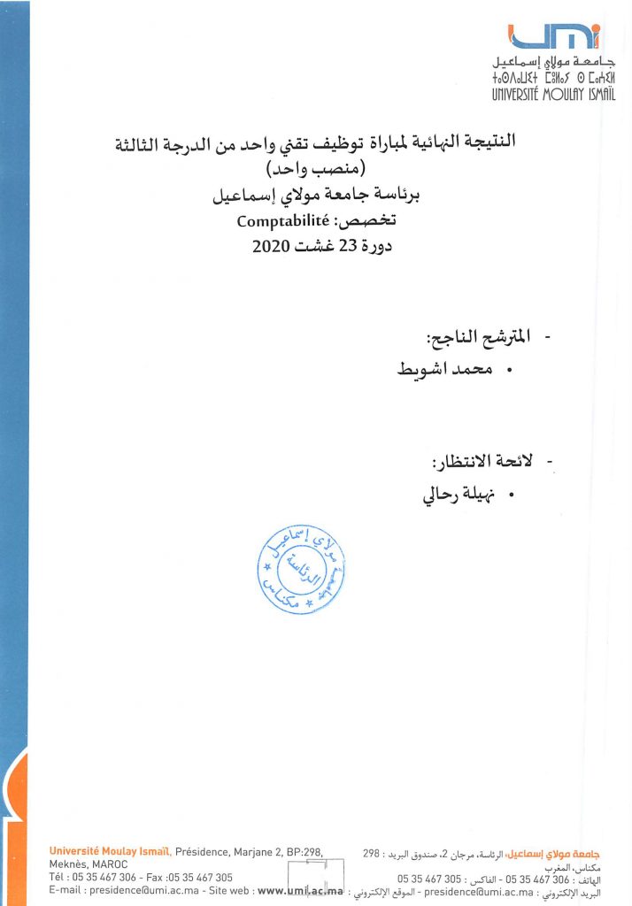 النتيجة النهائية لمباراة توظيف تقنيين من الدرجة الثالثة رئاسة جامعة مولاي إسماعيل دورة 2021/07/26 تخصص Infographie29 septembre 2021