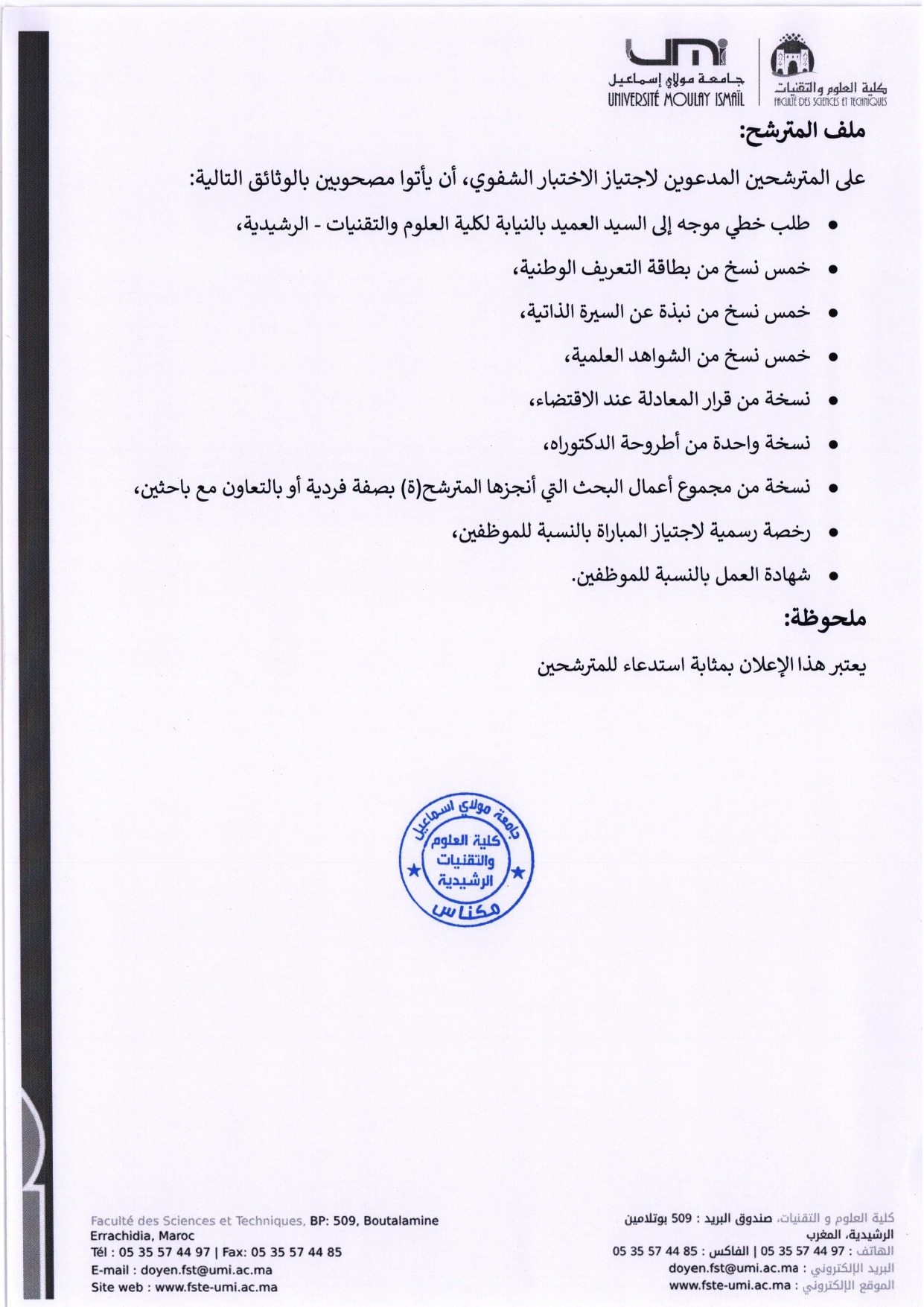 لائحة المدعوين لاجتياز اختبار العرض والمناقشة لتوظيف ثلاثة أساتذة (03) محاضرين في: Génie Logiciel : تخصصدورة 20 يونيو 2024 Vous devriez également aimer Signature d’une convention de coopération entre l’Université Moulay Ismail et l’Université Islamique UINSUSKA d’Indonésie.12 février 2013 Coopération Maroco-Tunisienne : Appels à Proposition pour le financement des projets de recherche – 20195 octobre 2018 انتخاب ممثلي الطلبة بمجلس الجامعة9 décembre 2020