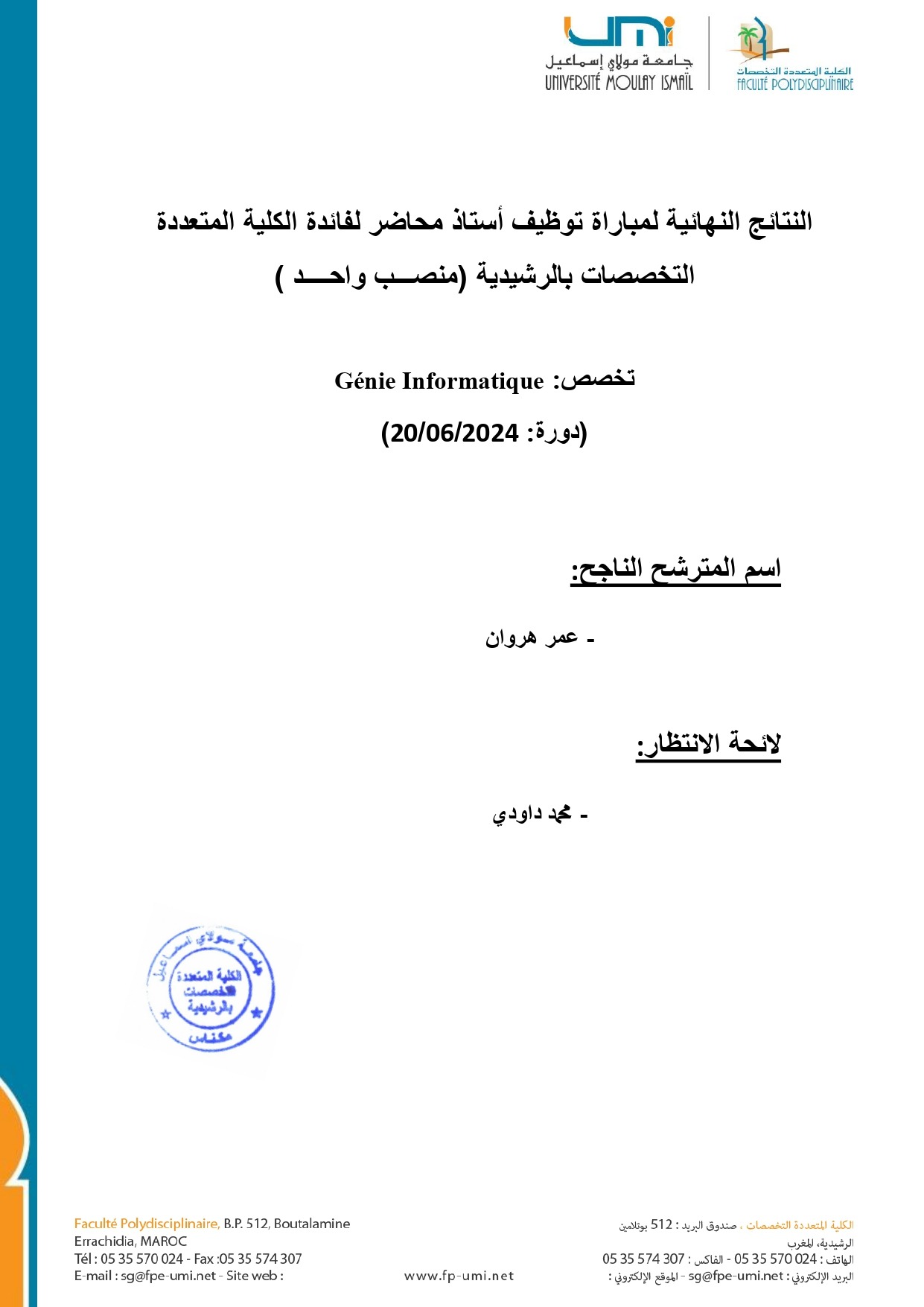 Résultat final du concours de recrutement MCà la Faculté polydisciplinaire d’Errachidia spécialité :– Génie informatique– الإعلاميات Vous devriez également aimer Appel à candidatures pour le 4ème Forum des Arts (mars 2016)23 novembre 2015 Anglais : النتائج النهائية لمباريات توظيف أستاذ محاضر تخصص20 septembre 2024 A delegation from the French Embassy visiting Moulay Ismail University20 décembre 2016